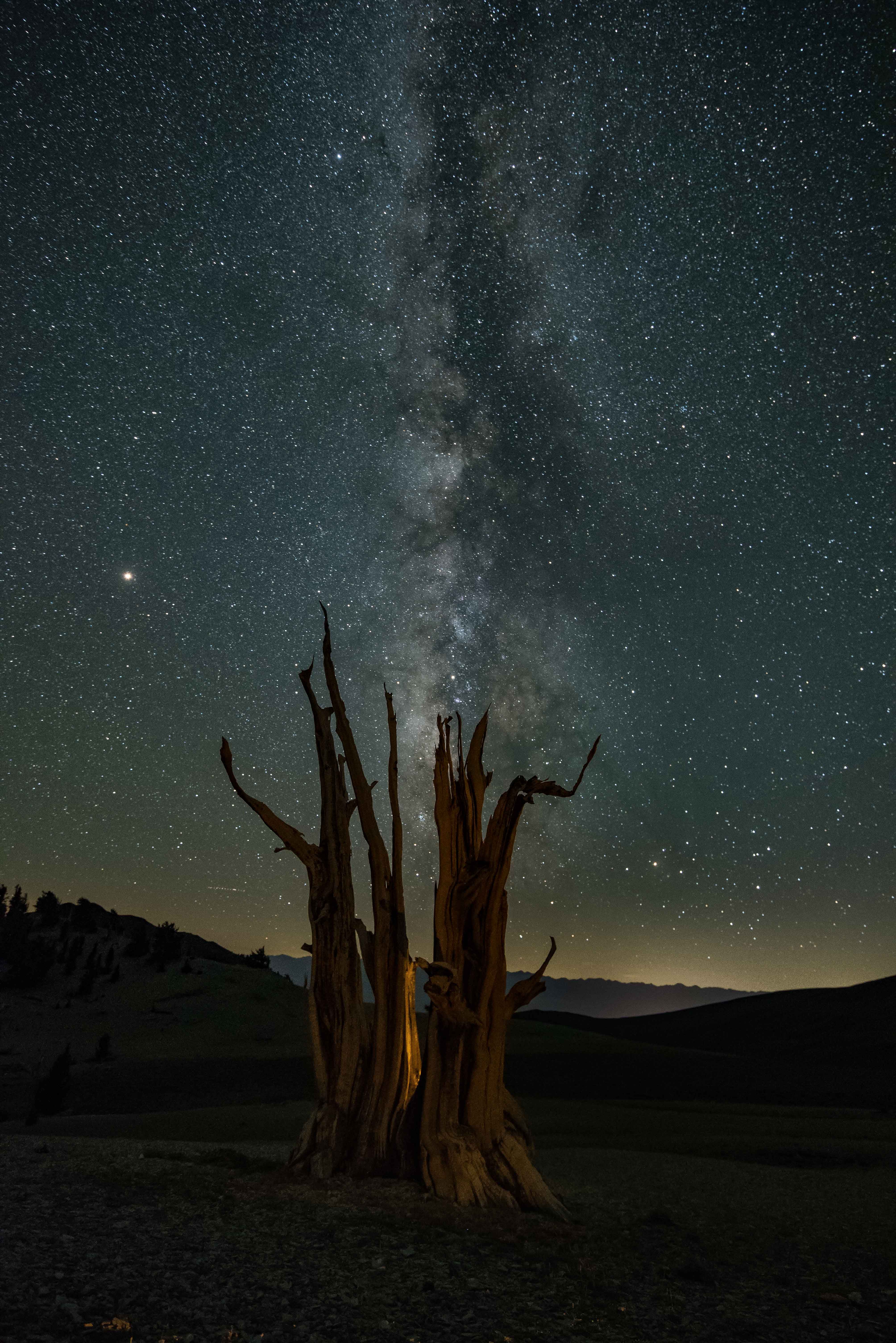 Night sky shot of an old bristle-cone pine with the milky way emanating from the center of the tree.