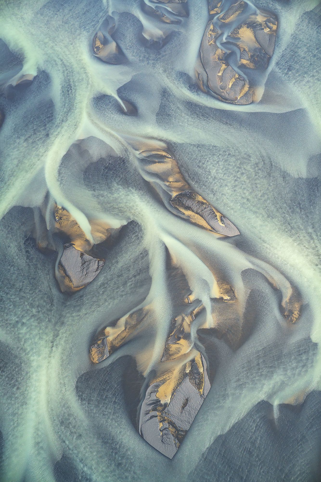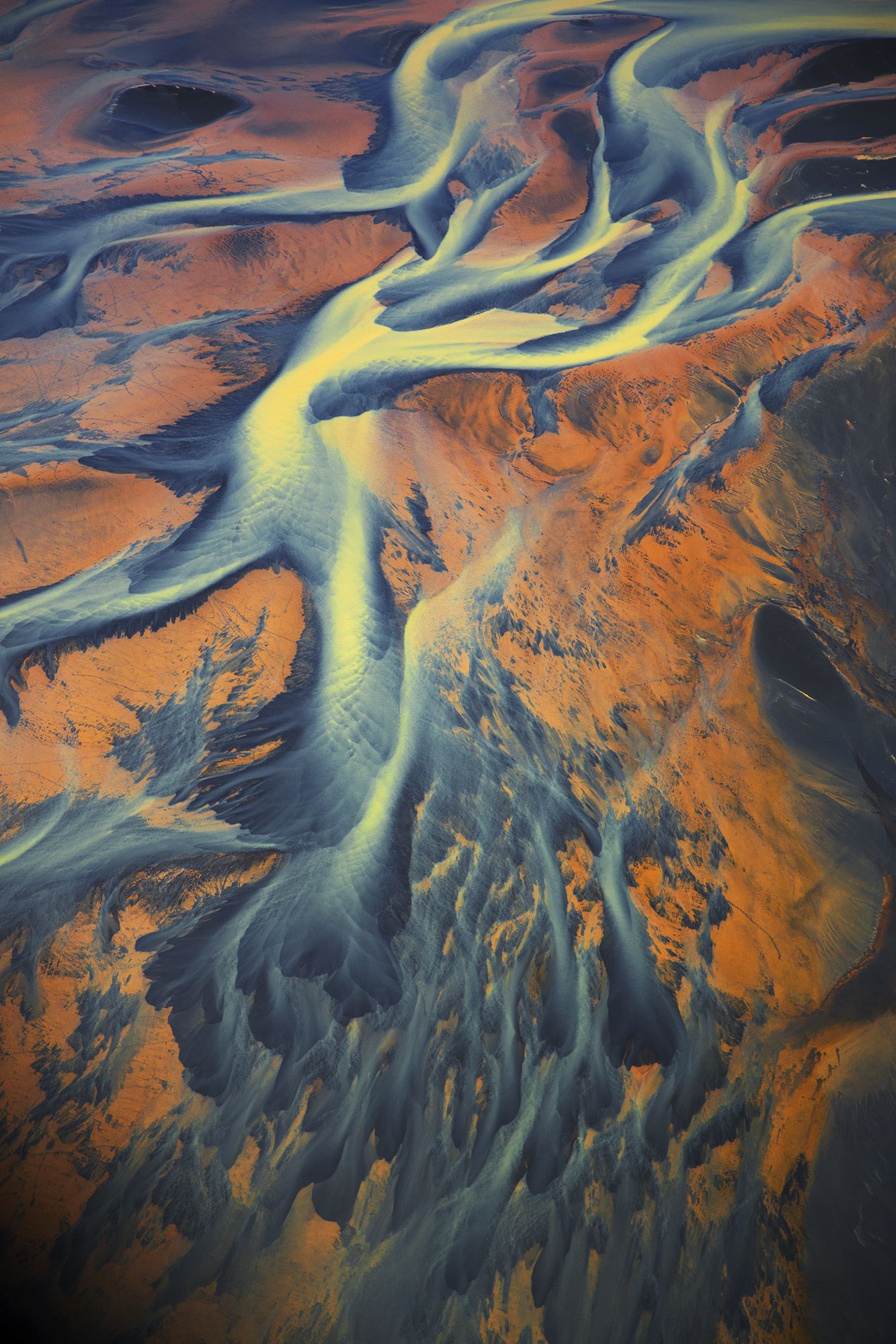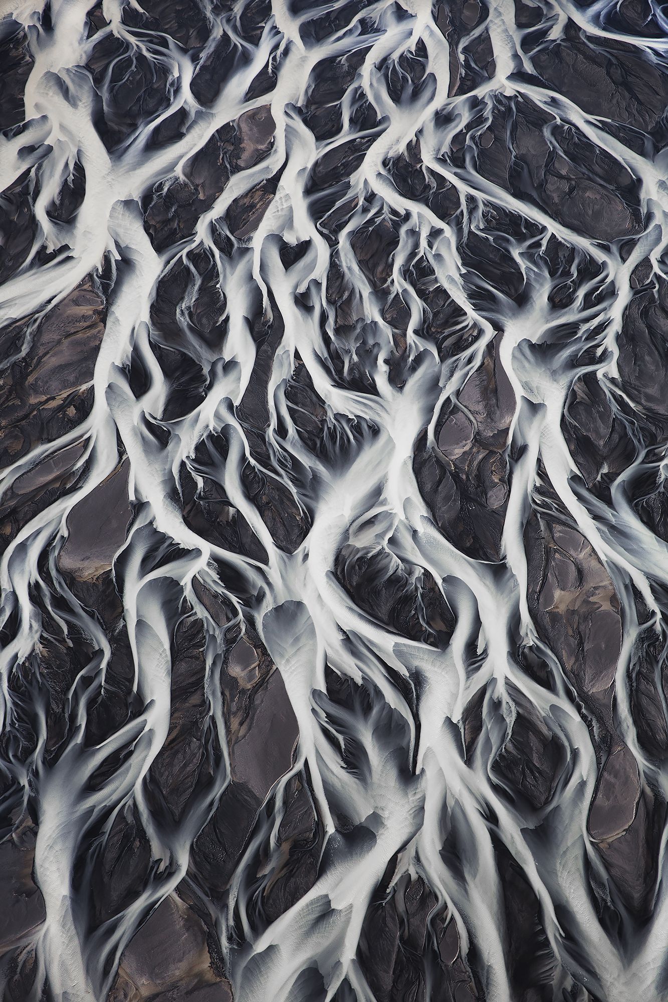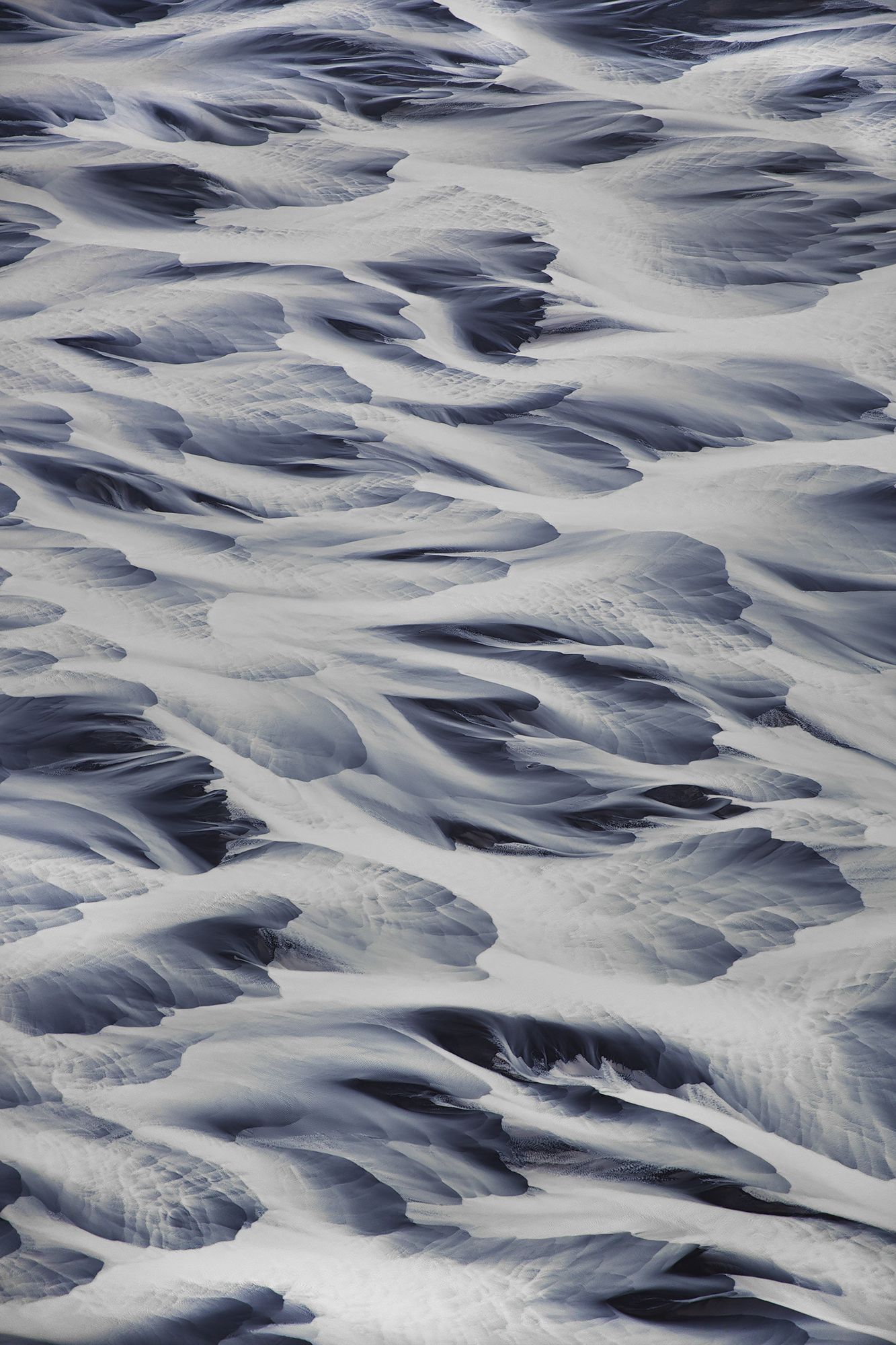 Patterns in nature fascinate me, so I am particularly drawn to the patterns formed by the glacial meltwater in the south of Iceland. The meltwater makes its way to the ocean over large lava sand fields such that when viewed from the air, look like large abstract paintings. I returned to these ever changing "river deltas" several times over the course of a few years, always by helicopter, in order to document the beautiful patterns formed by the interplay of water, sand, rock and silt.
