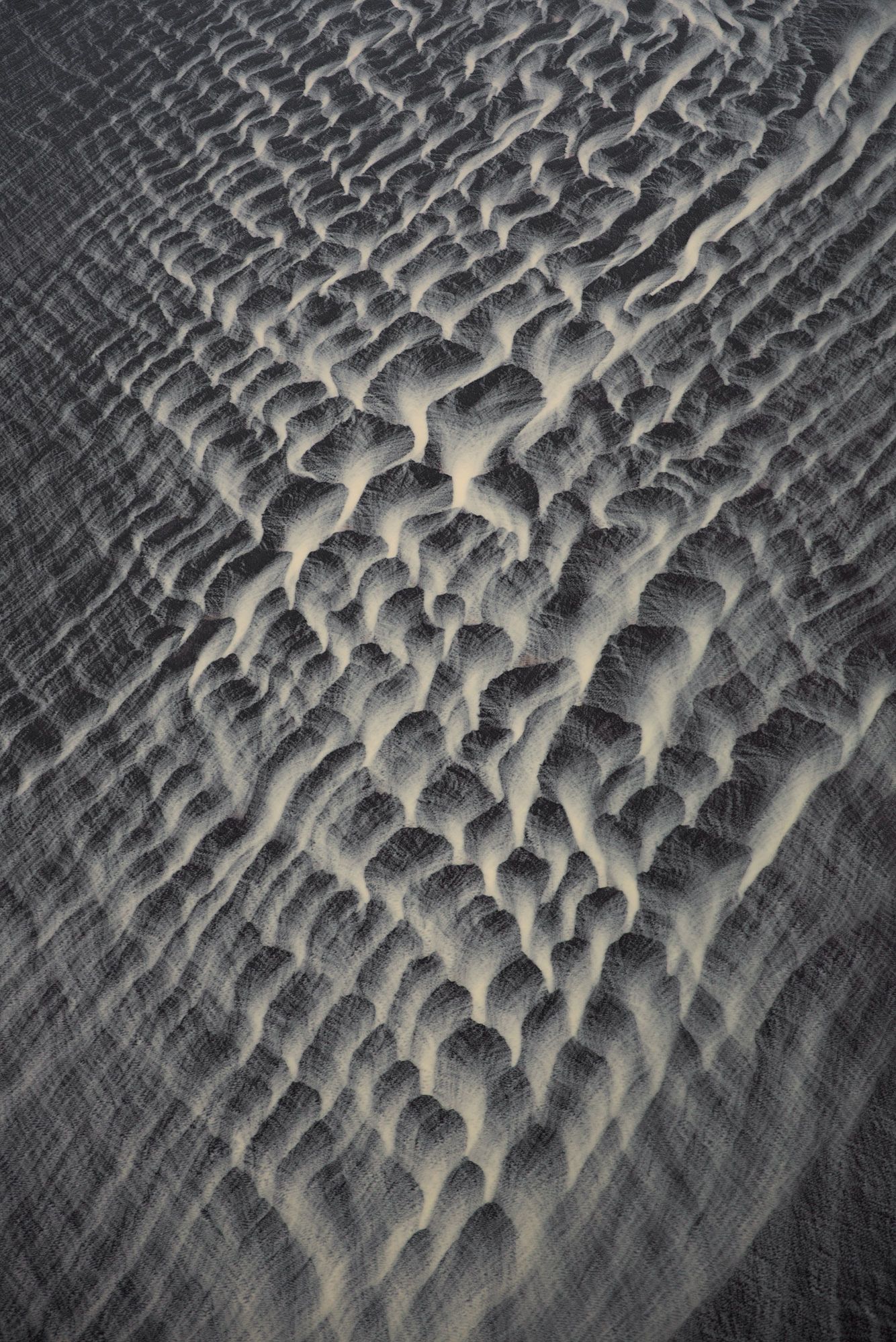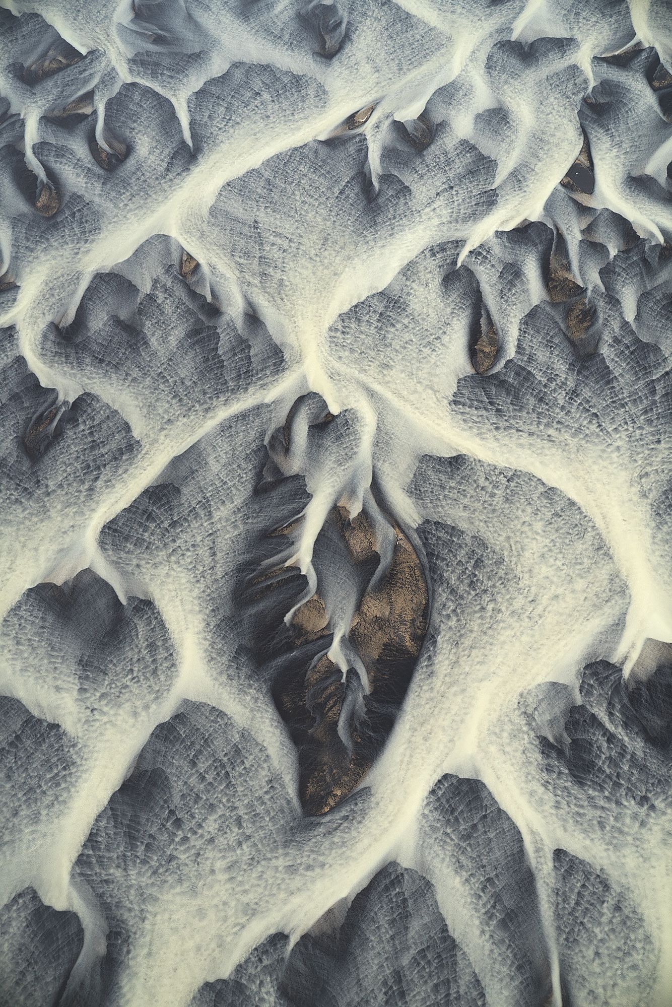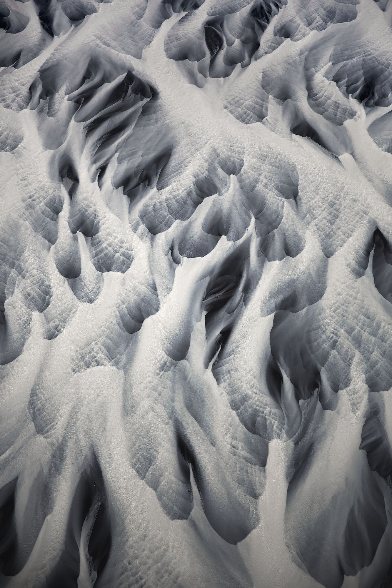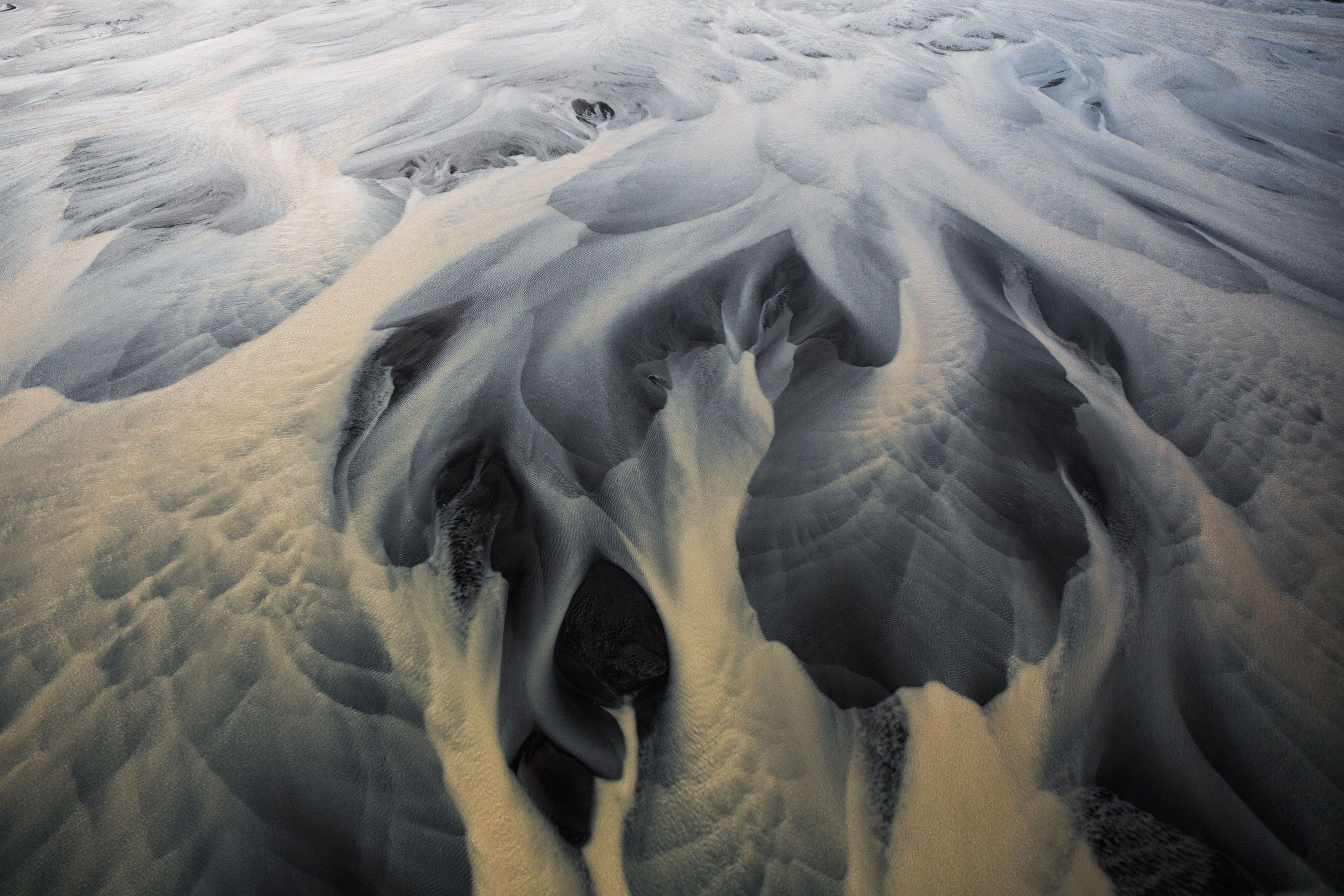 Patterns in nature fascinate me, so I am particularly drawn to the patterns formed by the glacial meltwater in the south of Iceland. The meltwater makes its way to the ocean over large lava sand fields such that when viewed from the air, look like large abstract paintings. I returned to these ever changing "river deltas" several times over the course of a few years, always by helicopter, in order to document the beautiful patterns formed by the interplay of water, sand, rock and silt.