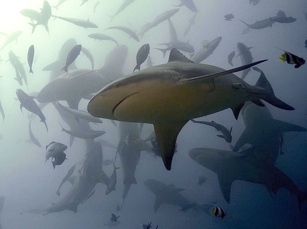 During a shark dives more than 30 bullsharks come above my head and started a bull shark dance into school of fishes.