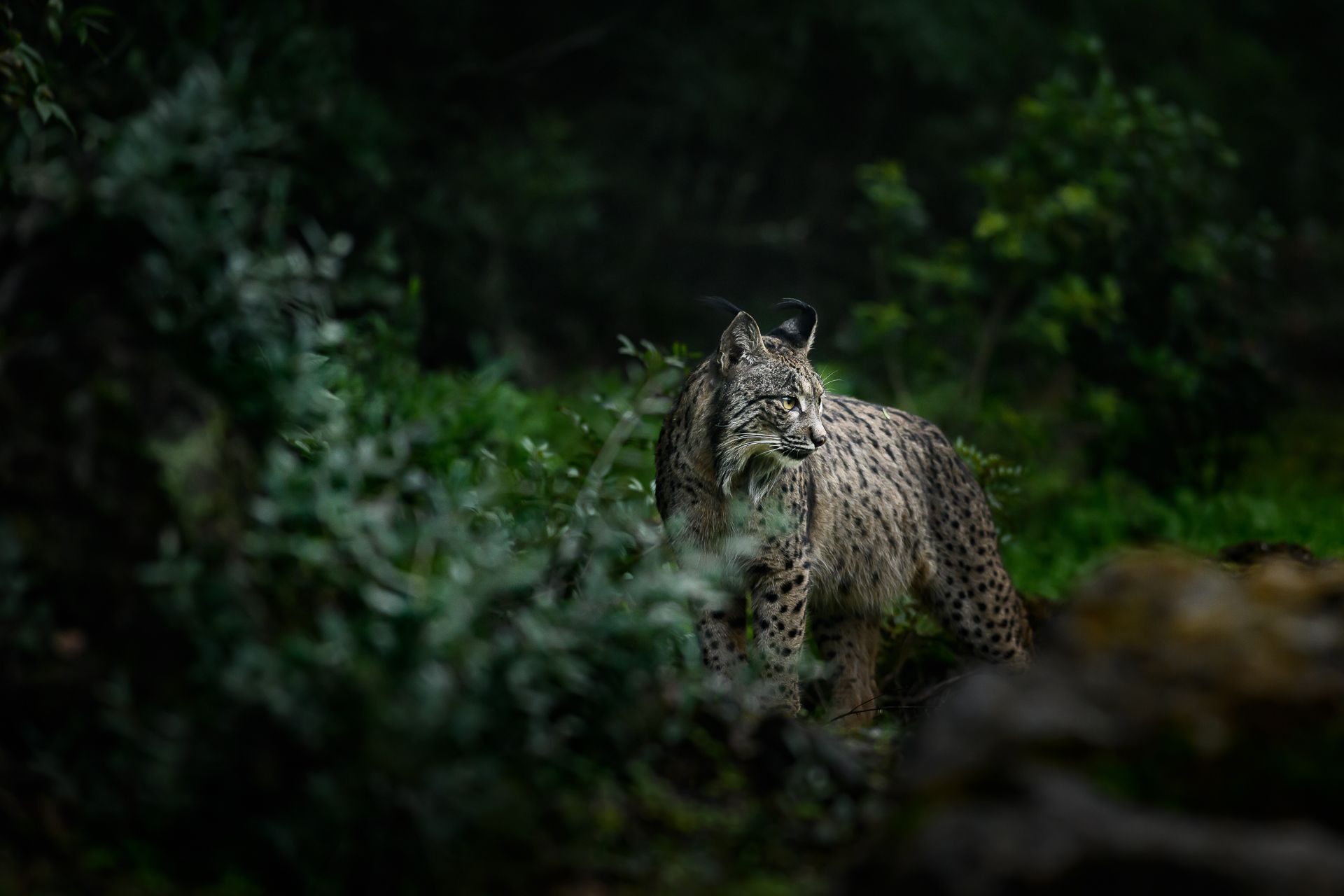 A highly endangered Iberian lynx (Lynx pardinus) taking a break at a clearing in the forest near Adamuz, Spain. With only 500 or so individuals living in the wild, the Iberian lynx is categorised as EN-endangered in the IUCN Red List. Conservation efforts helped the species from extinction in the 2000's when only around a 100 animals roamed the Iberian peninsula.