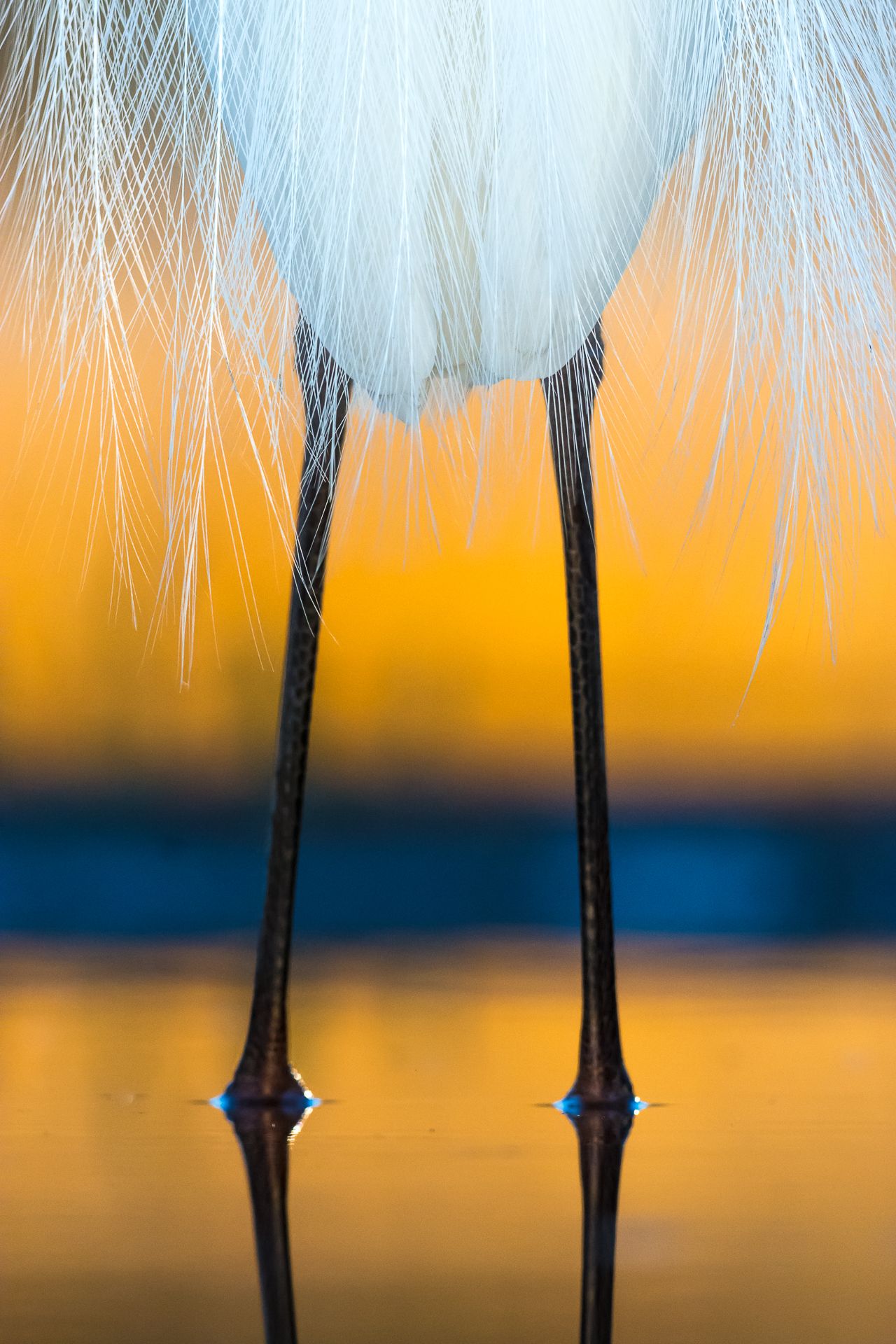 Egret in courtship gown standing in golden light reflected on the water surface.