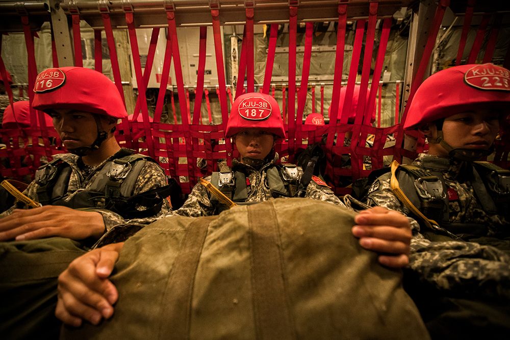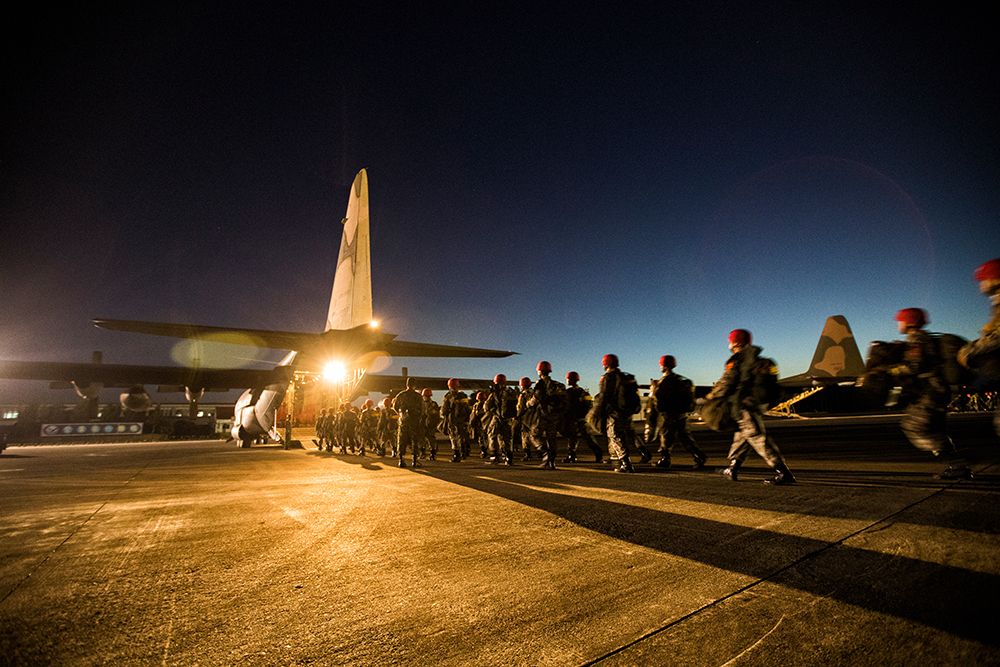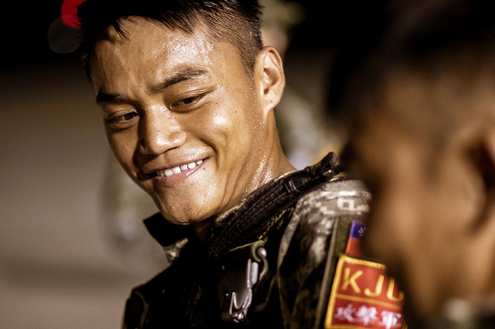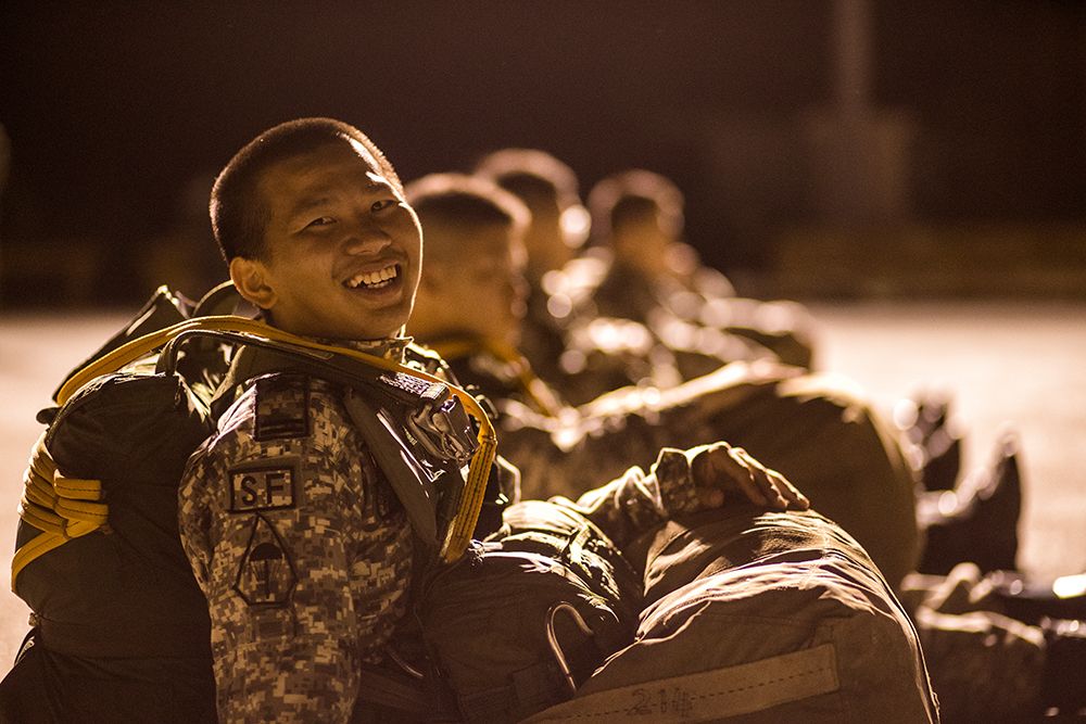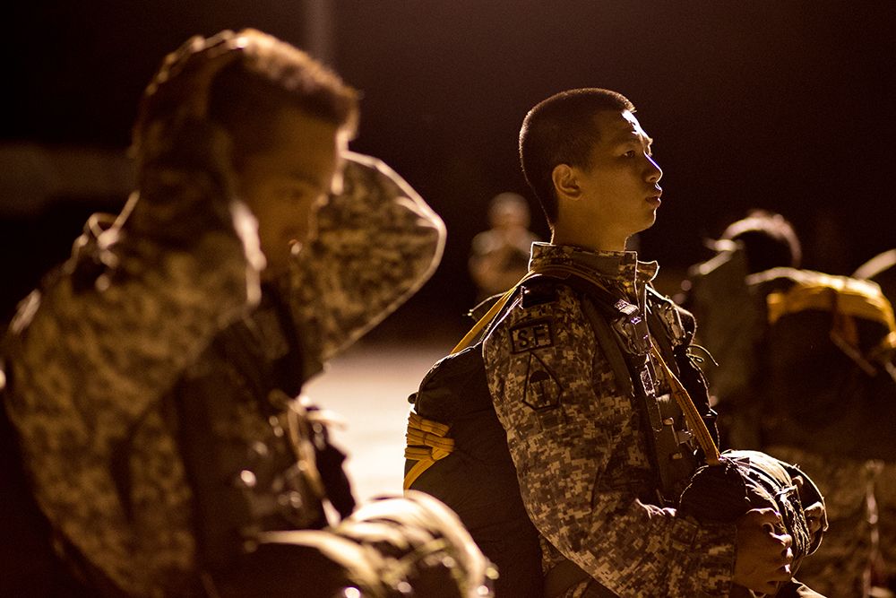 The Republic of China paratroopers perform parachute missions at dawn,Soldiers without fear,Go forward.