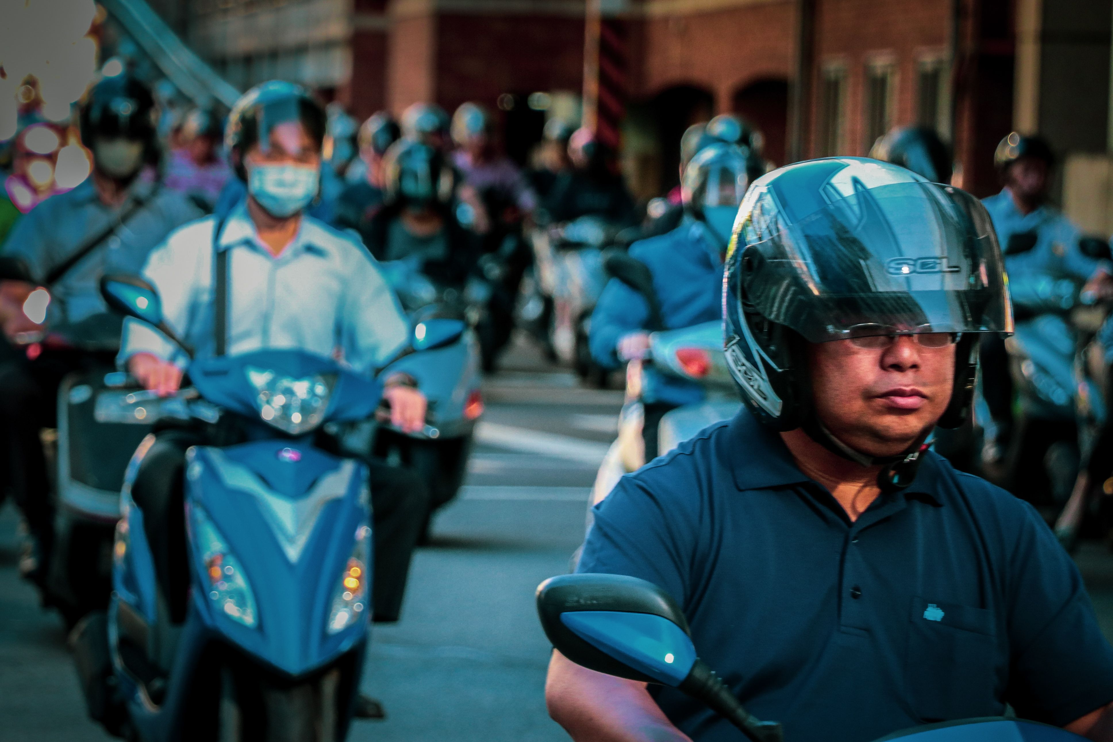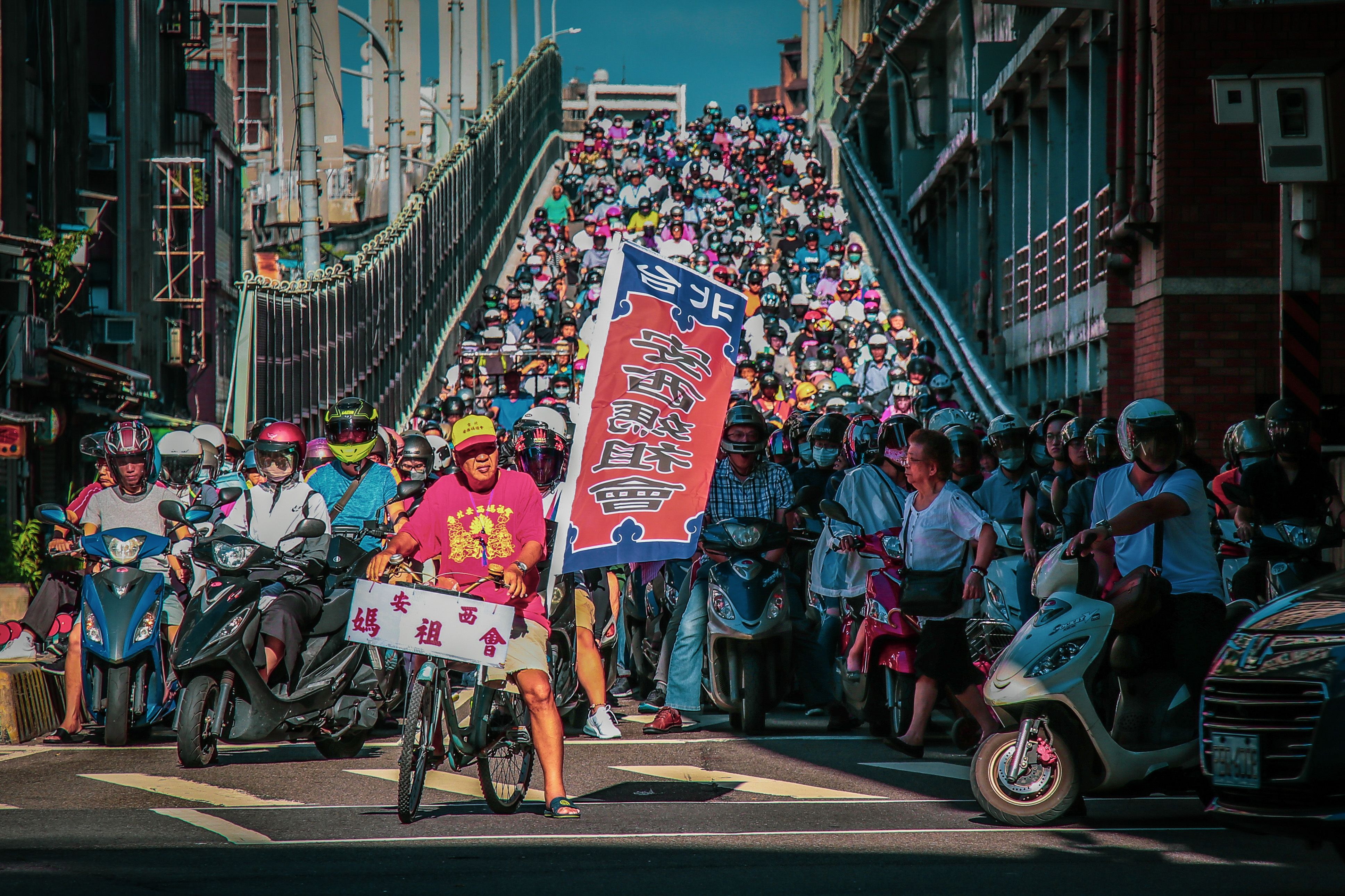 Taiwan has the highest scooter density in the world. According to the statistics of the Ministry of Communications of Taiwan, 71.1% of scooter riders will not choose to take public transportation because of the lower cost and high mobility. This is the bridge between Taipei City and New Taipei City. There are 15,000 scooters per hour through the bridge at the peak time, most of them are rushing to work. This scene that happens every weekday morning just like a waterfall.