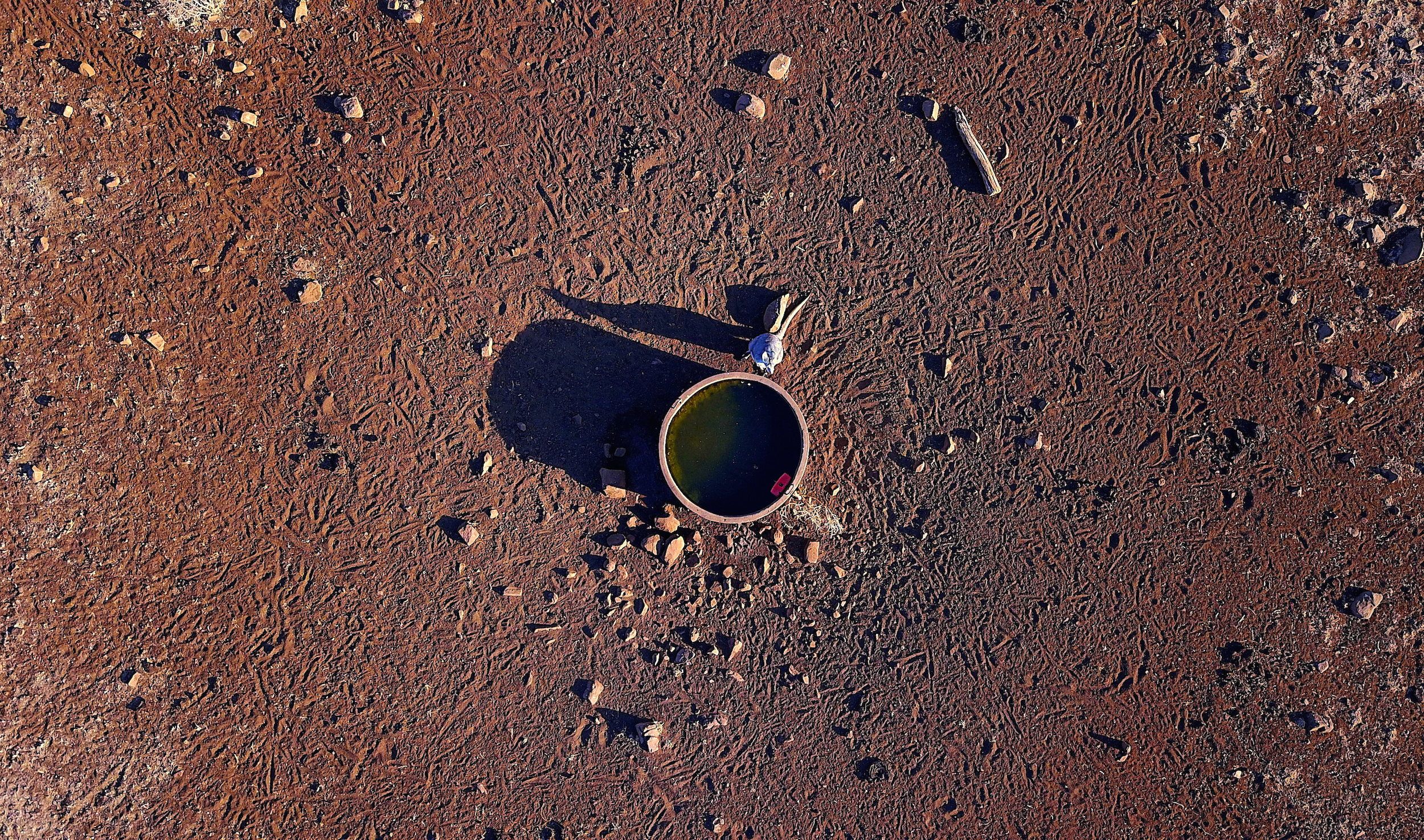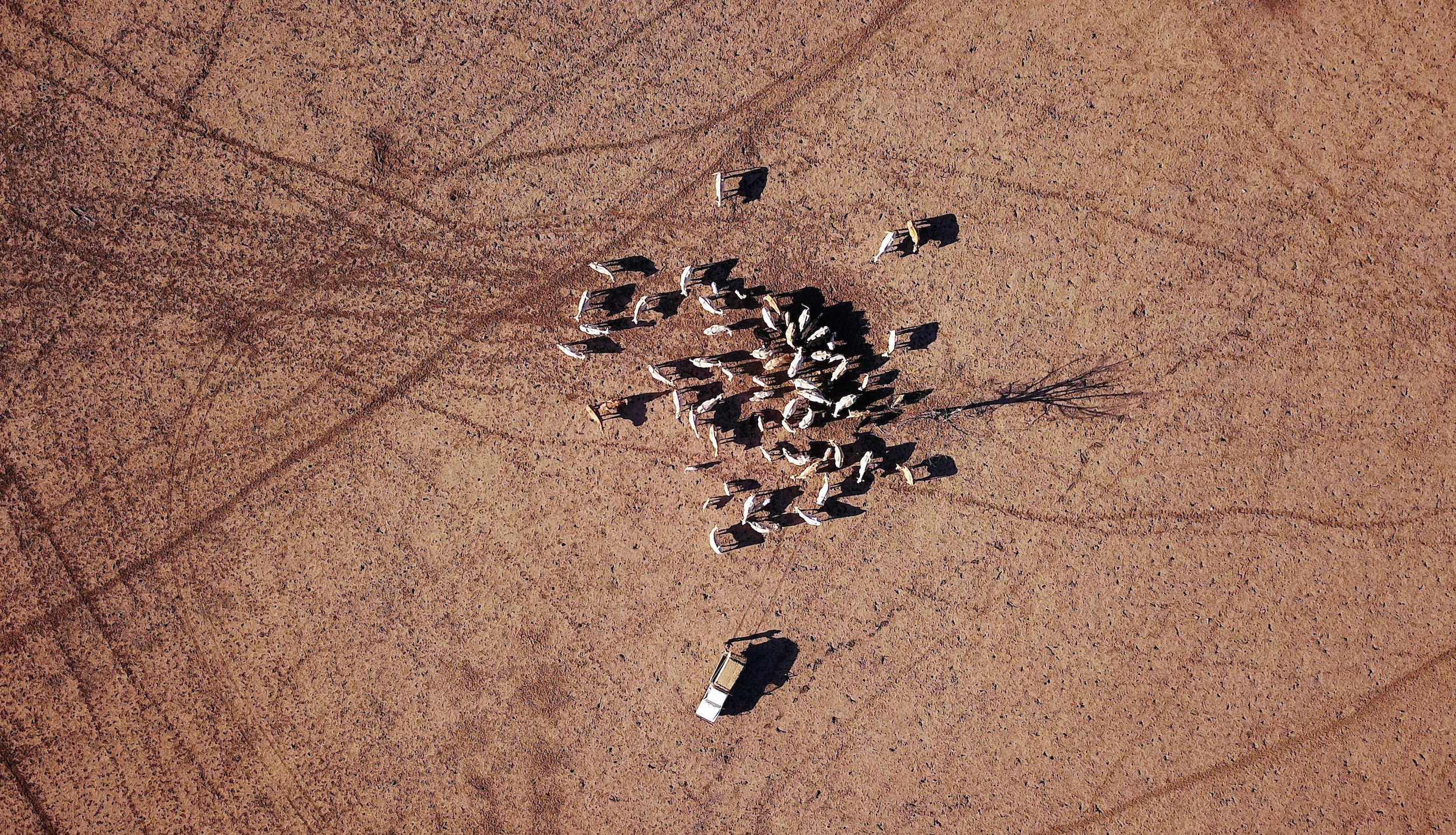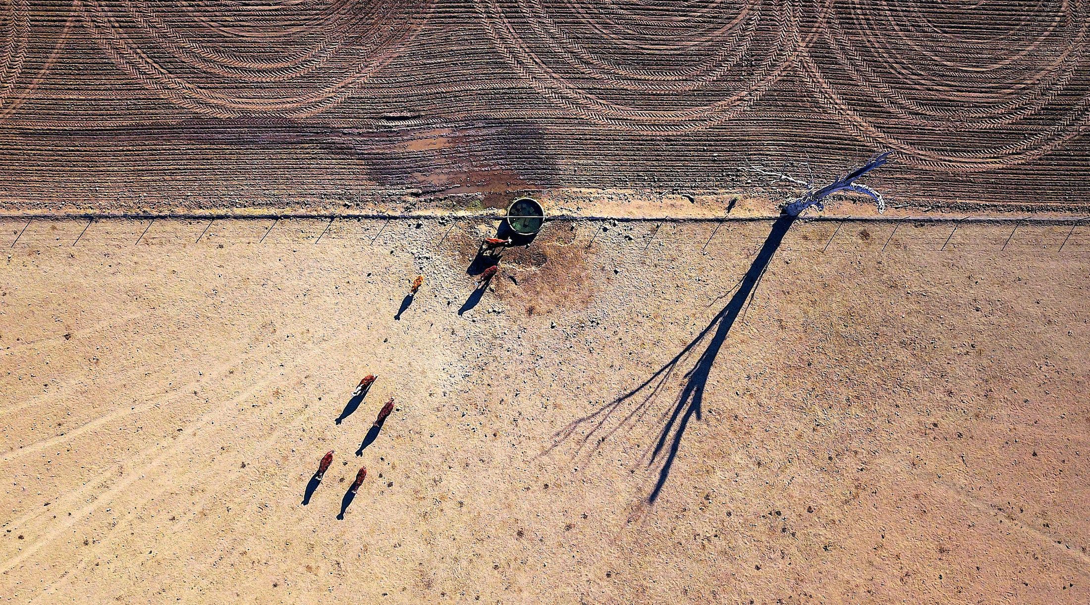 From ground level, Australia’s drought looks like a featureless, brown dustbowl, but from the air it transforms into an artistry of colour and texture as the land cracks under a blazing sun. The remnants of water reservoirs and dried-up creeks, along with the tracks made by starving cattle and sheep resemble the patterns in Aboriginal paintings that tell of an ancient mythology, with their shadows stretching across the land creating a surrealist image. The entire state of New South Wales in eastern Australia was drought declared in July, making it the worst drought in living memory.