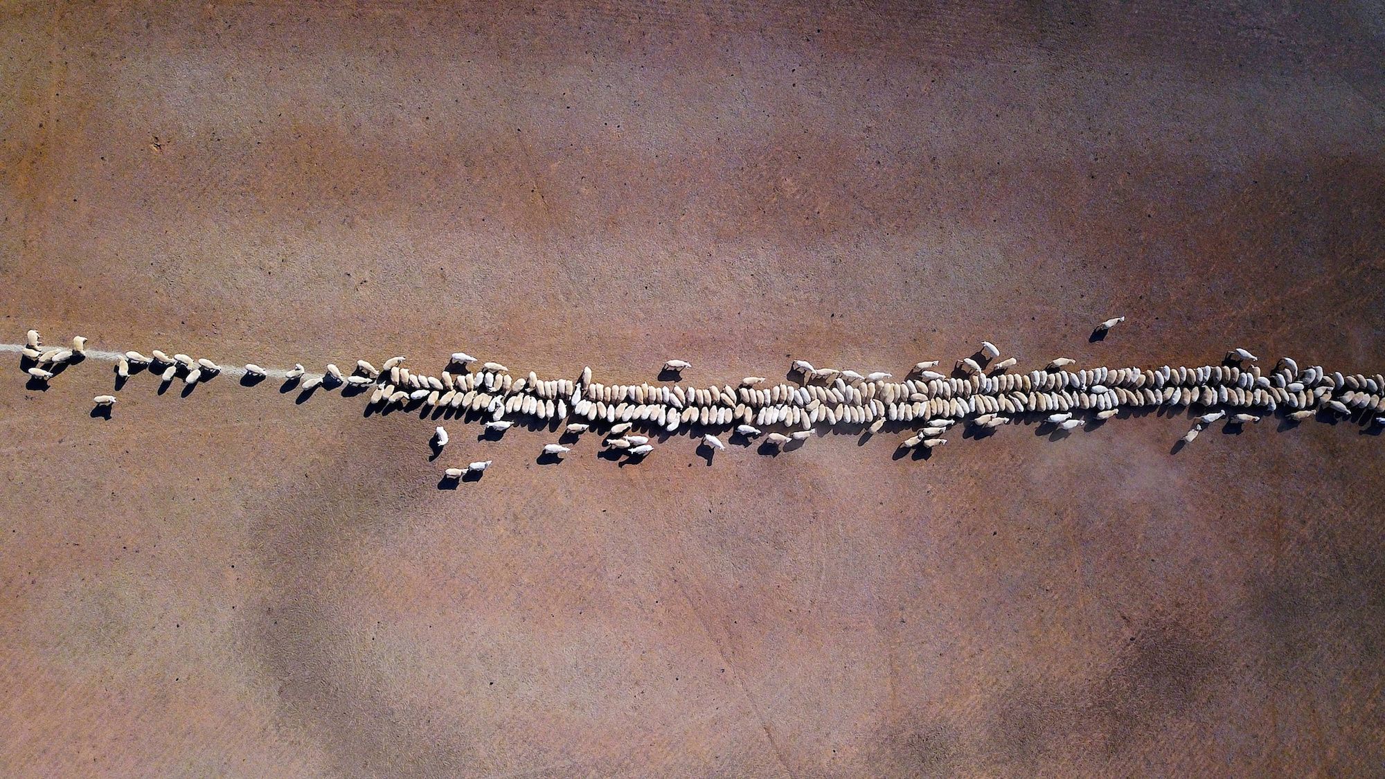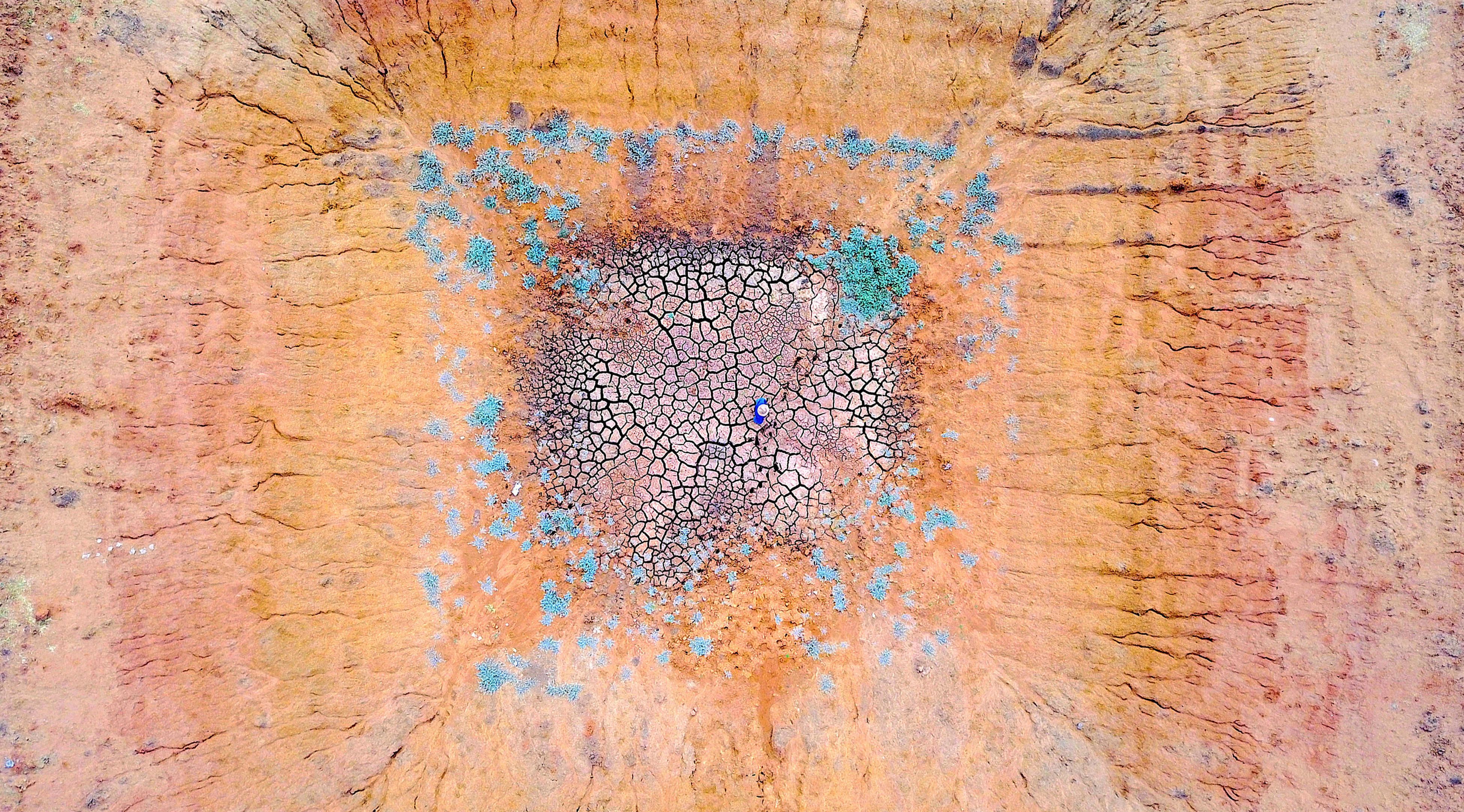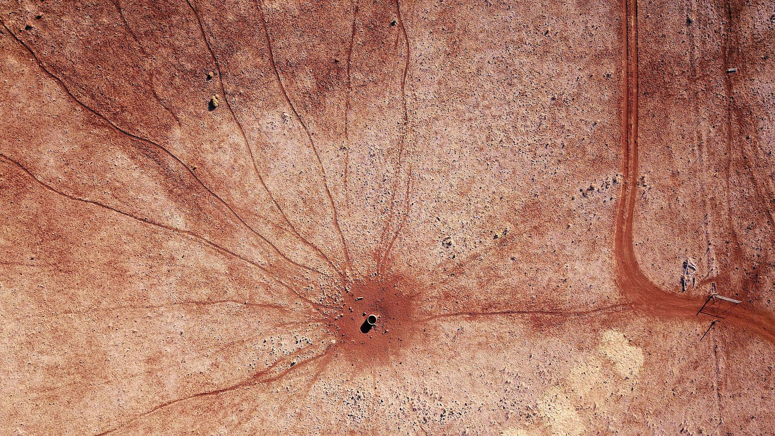 From ground level, Australia’s drought looks like a featureless, brown dustbowl, but from the air it transforms into an artistry of colour and texture as the land cracks under a blazing sun. The remnants of water reservoirs and dried-up creeks, along with the tracks made by starving cattle and sheep resemble the patterns in Aboriginal paintings that tell of an ancient mythology, with their shadows stretching across the land creating a surrealist image. The entire state of New South Wales in eastern Australia was drought declared in July, making it the worst drought in living memory.