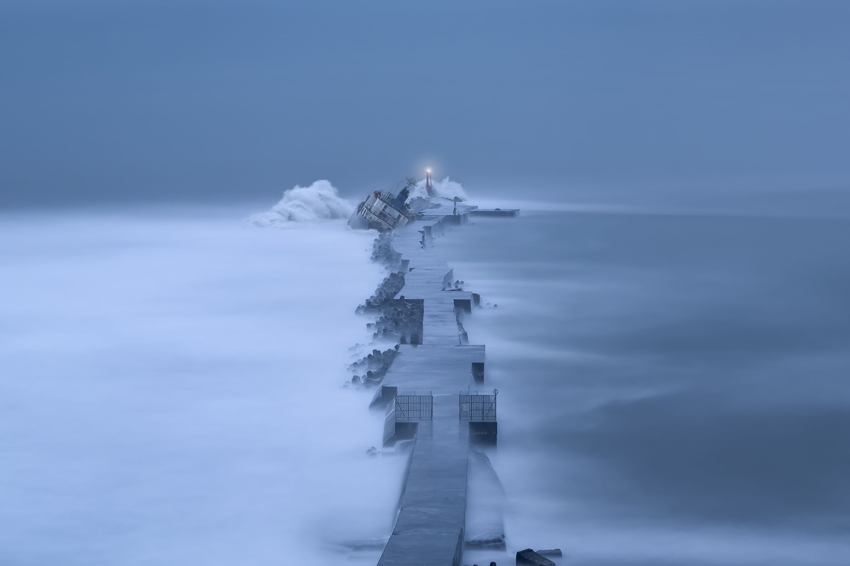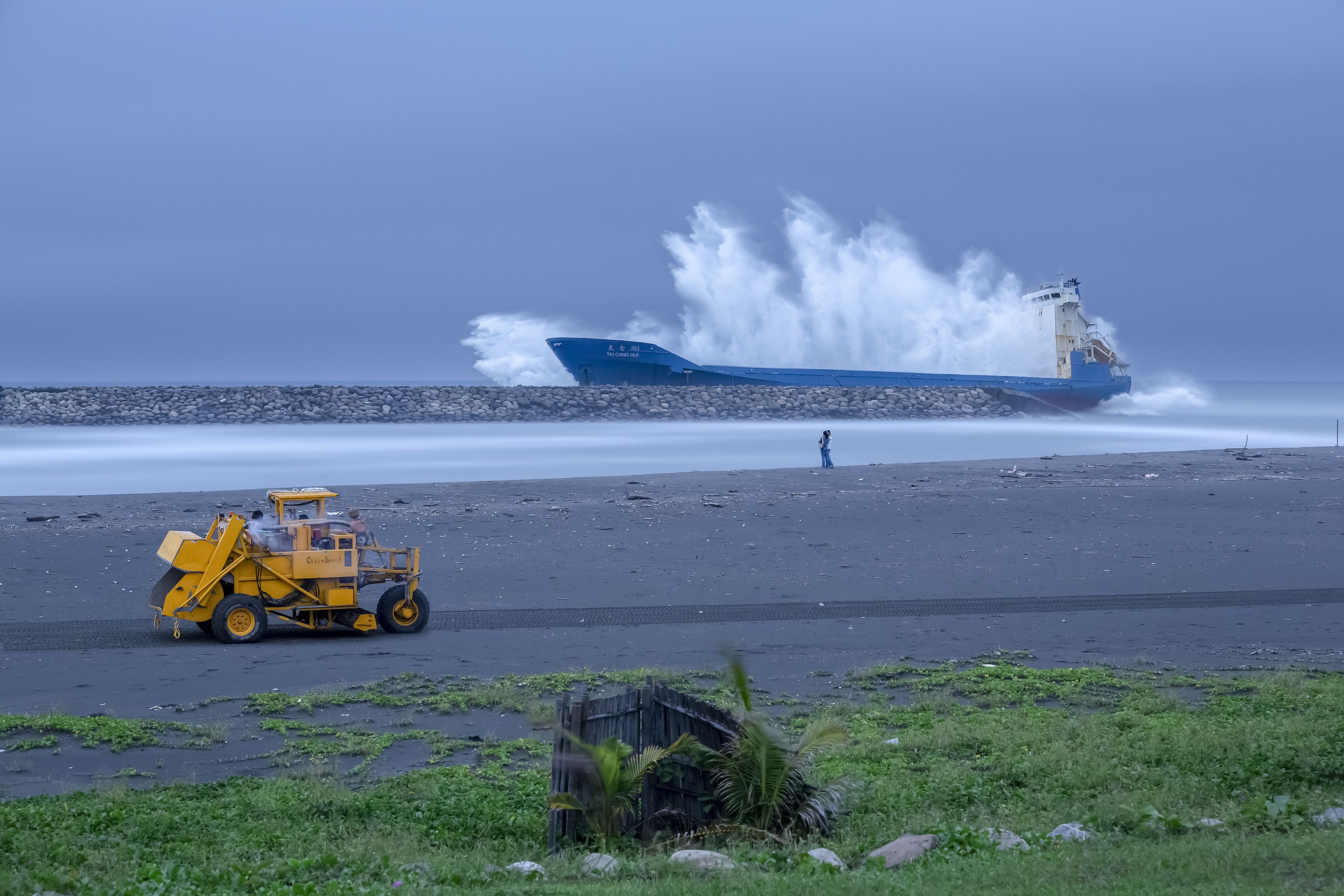 There are many ships of stranded in Typhoon`s season.The power of nature the pollution of sea.We should always think seriously about it.Long Exposure