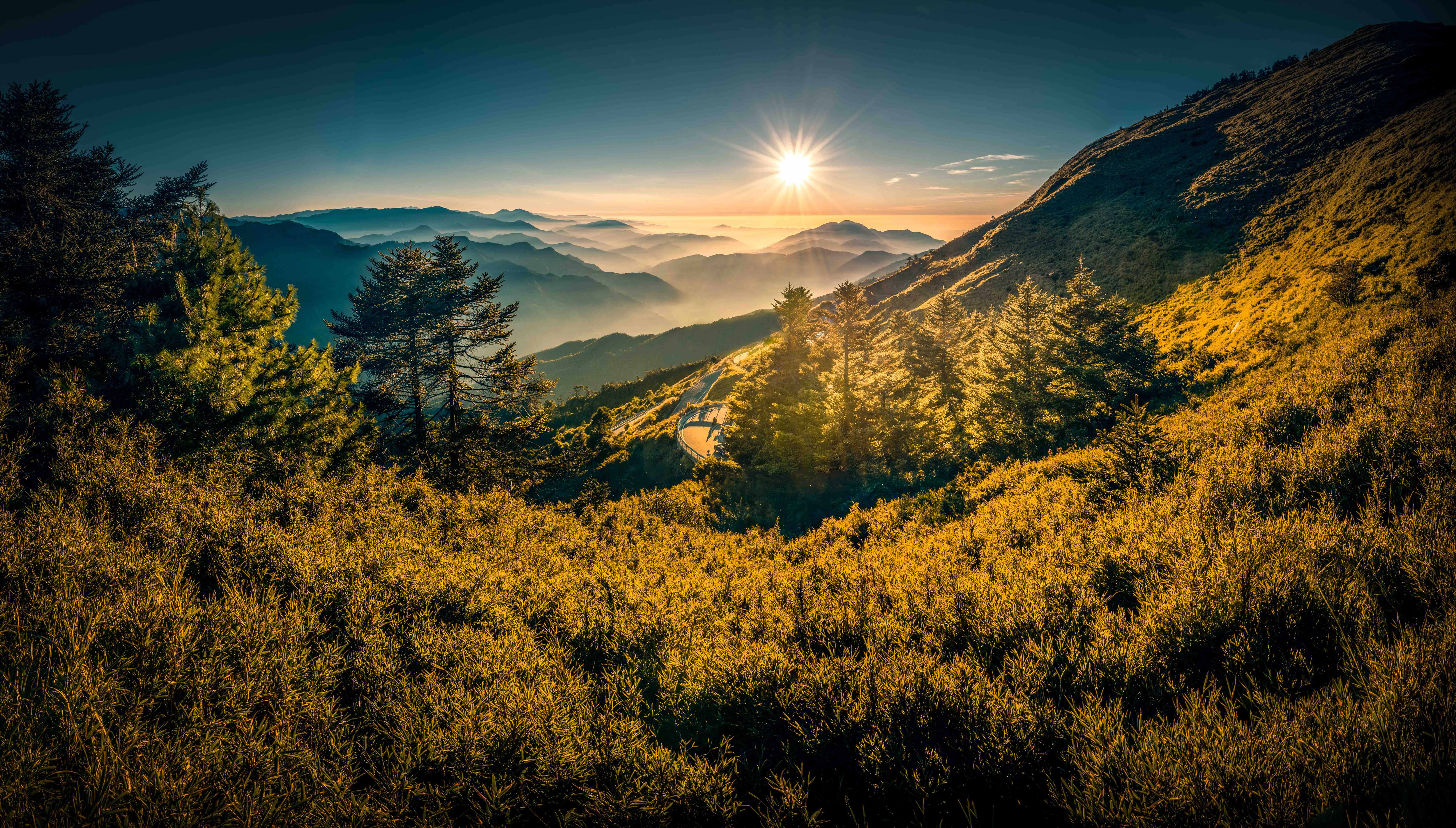 The dazzling sun illuminated the ground covered with grass. Thousands of mountains are below the mountain where I stood. Having visited this spot for several times, I eventually captured the best moment in my mind.